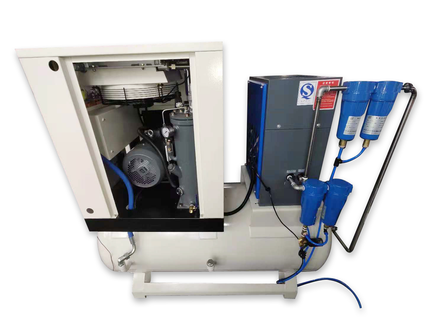 包含螺桿壓縮機(jī),冷凍式干燥機(jī)、精密過(guò)濾器、儲(chǔ)氣罐等部件集于一體。